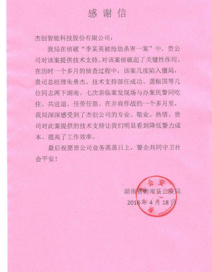 近日,湖南省衡南公安局发来感谢函,对九游ninegame智能在近期协助侦破“李某英被抢劫杀害一案”表示感谢,目前相关犯罪嫌疑人已被依法刑事拘留,案件正在进一步侦办中。